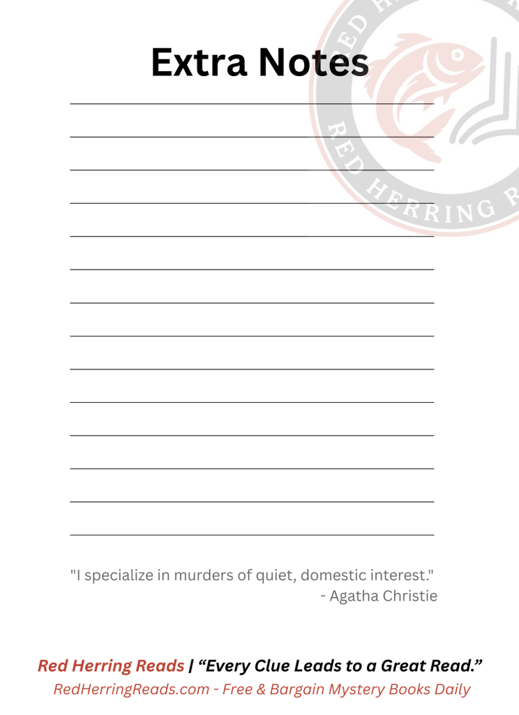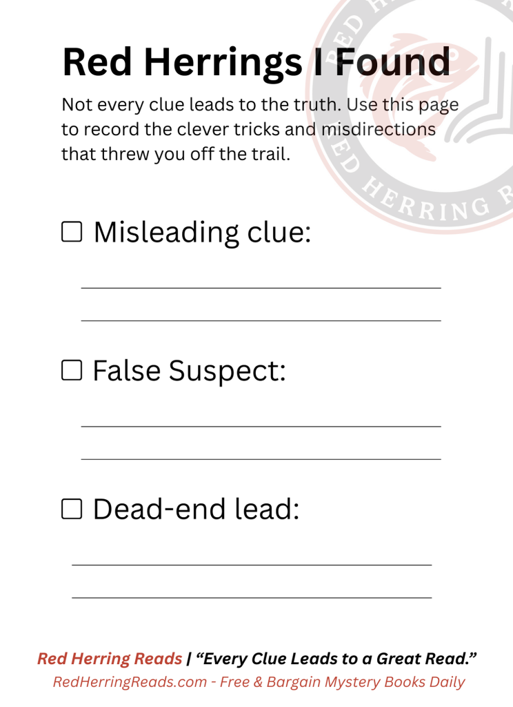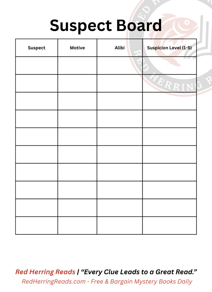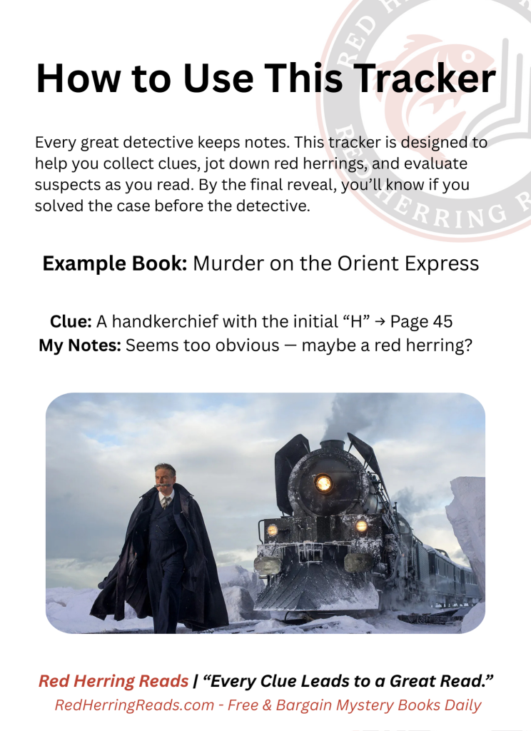 Download the Mystery Clue Tracker — your free, printable notebook to record suspects, clues, and red herrings while you read.